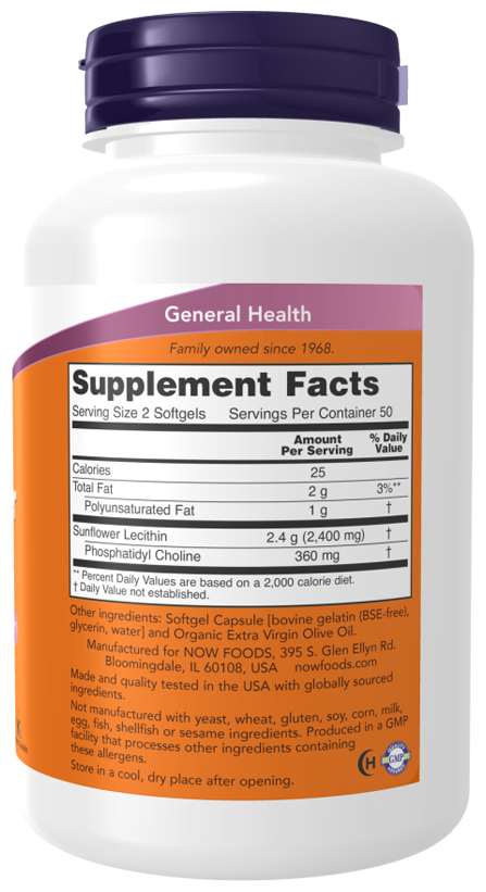 Подсолнечный лецитин содержит фосфатидилхолин, самый распространенный фосфолипид в клеточной мембране, который играет ключевую роль в сигнальной и синаптической функции клеток. Кроме того, подсолнечный лецитин содержит большое количество природного фосфатидилинозитола, фосфатидила этаноламина и незаменимых жирных кислот. Лецитин в рационе помогает эмульгировать жиры, позволяя им растворяться в воде. Организм с легкостью усваивает и использует холин, содержащийся в этом фосфолипиде.